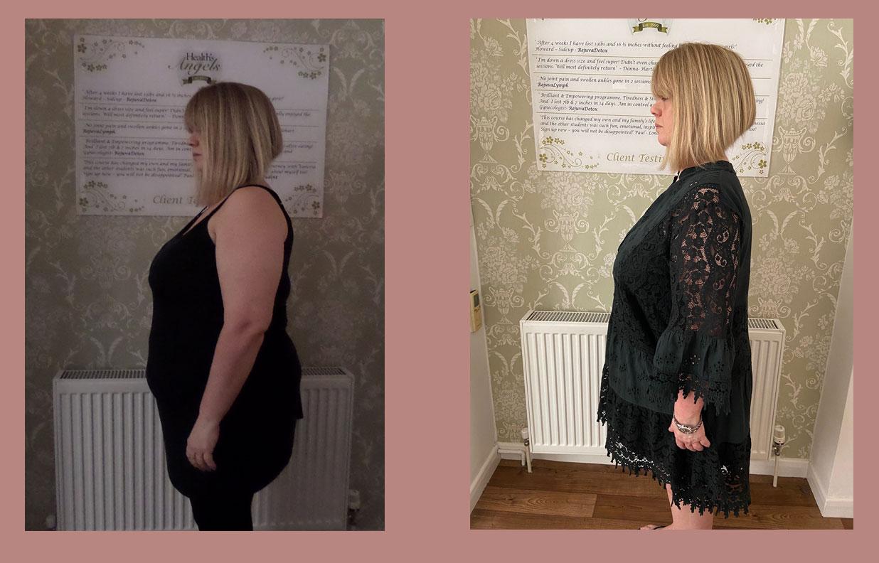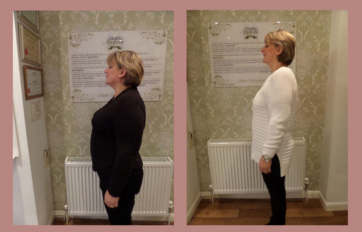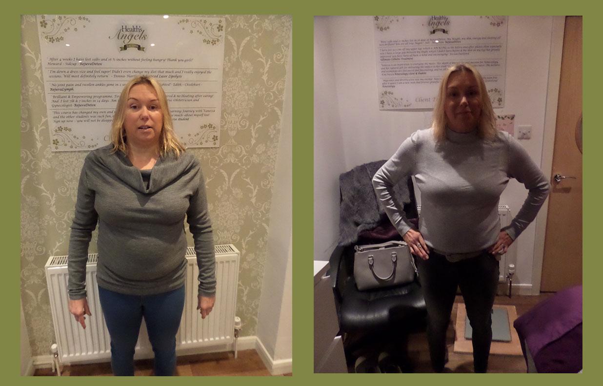 “I lost 9lb and 26 inches in four weeks. I can’t begin to explain how unwell I felt and looked!! 4 weeks later I feel fantastic, well, alive and living my life to the full! I actually feel quite emotional about it because I have my life back on track with the help of all the lovely staff. I am going to continue having treatments and follow the maintenance plan. Thank you so much”.