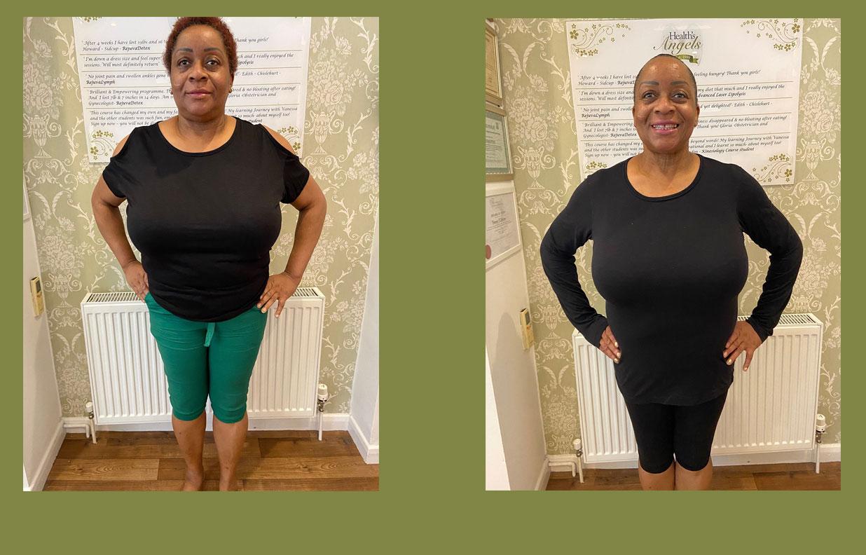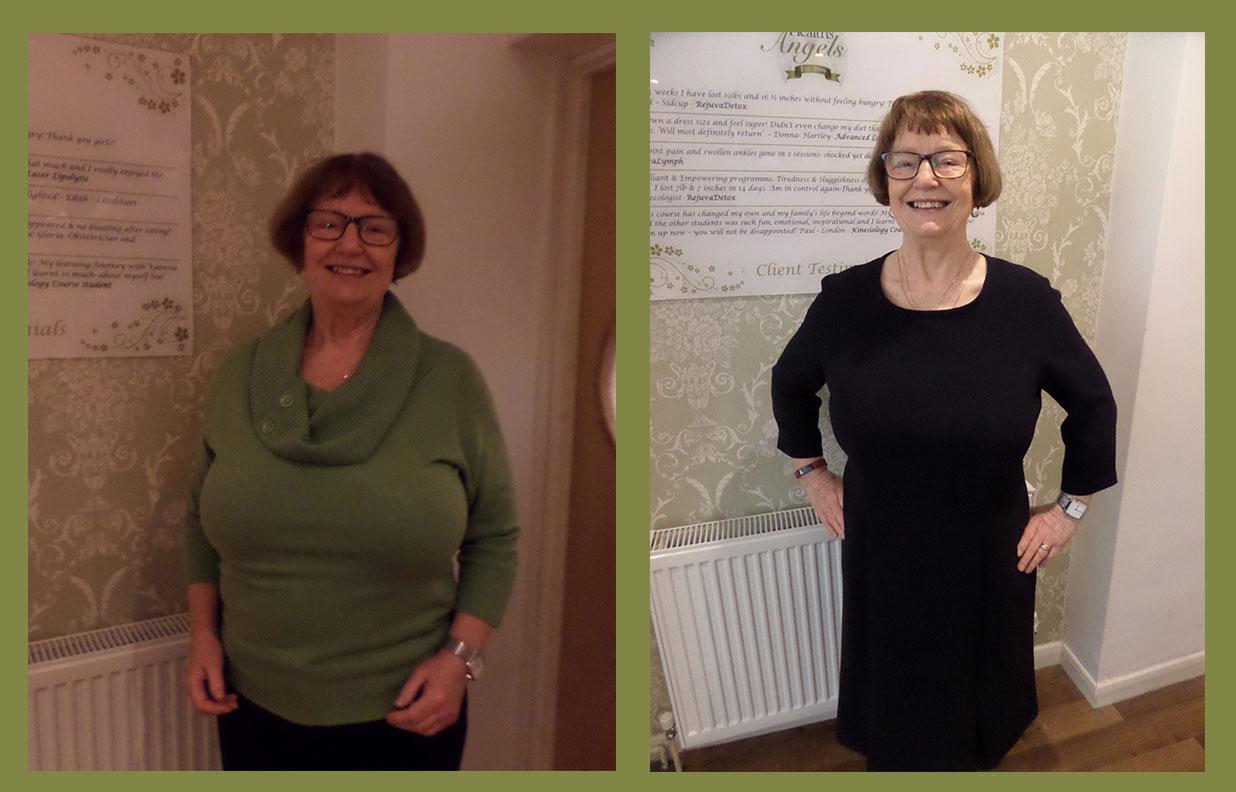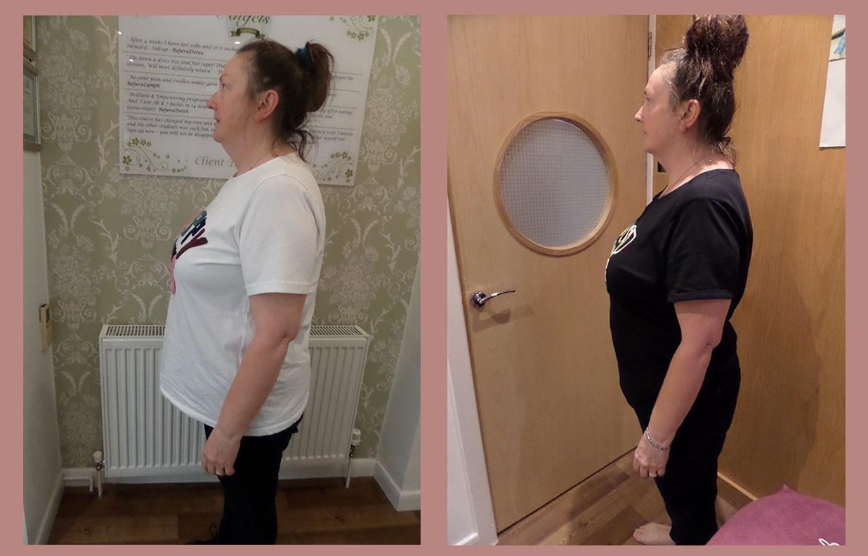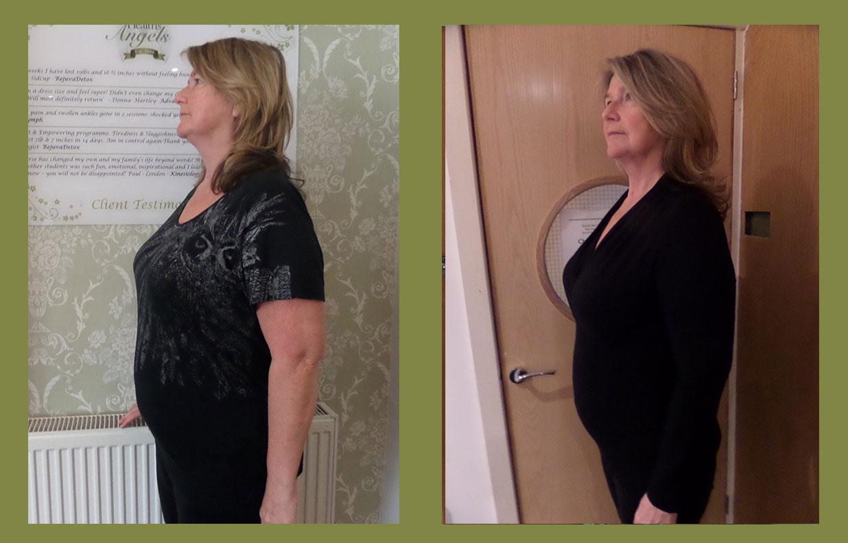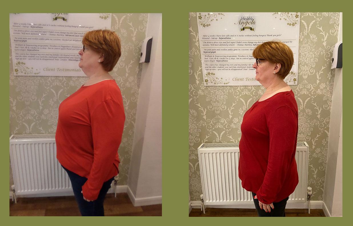 “I’ve tried many ways to lose weight, and nothing seemed to be working. I came across RejuvaDetox and thought I would give it a go. I did a 6-week programme and lost 17lbs and 24 ½  inches. I was nervous at first, but the ‘angels’ make you feel at ease. I found the treatments relaxing and liked the fact that it detoxed my body and concentrated on my belly fat.  For the first time in ages, I can fit into my clothes comfortably and feel good about myself. I’ve changed bad habits and feel confident to maintain my weight loss. “- Mary